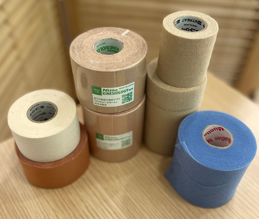 当店では様々な種類のテープで動きをサポートする目的や、持続的に皮膚への刺激を入れて鈍くなった感覚を変えていく目的など多様な使い方をします。
