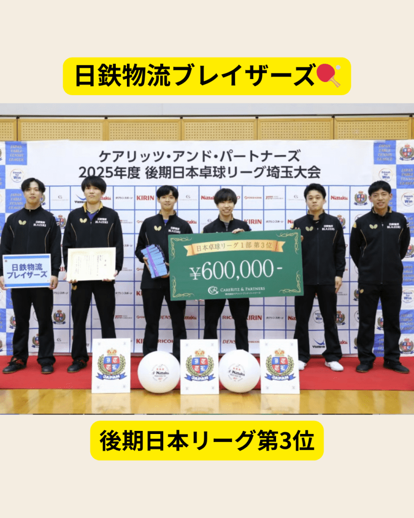 こんばんは!今年からお世話になっている日鉄物流ブレイザーズさんの卓球後期日本リーグに11月13日〜16日まで帯同してきました。結果は3位。あと少しの差で優勝は逃しましたが、12月に行われるファイナル4(プレーオフ)に進出することができました。まだまだこれから強くなるチームです!皆さま応援のほどよろしくお願いいたします!(個人賞)優秀ペア賞高見真己選手・野田颯太選手(新人賞)野田颯太選手